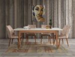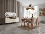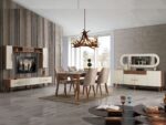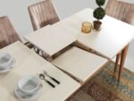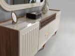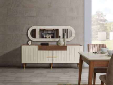 Estetik ve dayanıklılığı bir araya getiren Bodrum Yemek Odası, 1. kalite yeni trend UD, aytaşı renk suntalam ve ön yüzlerde MDF üzeri krem boya uygulanarak üretilmiştir. CNC freze ve laezer CNC çalışması, gold kulplar ile zarif bir tasarım sunar. Özel yavaşlatıcılı çekmeceler sessiz ve kolay kullanım sunar. Açılır masa sayesinde ihtiyaç halinde ekstra alan oluşturulabilir. Üstün kalite ve dayanıklılık standartlarına uygun olarak üretilmiştir.