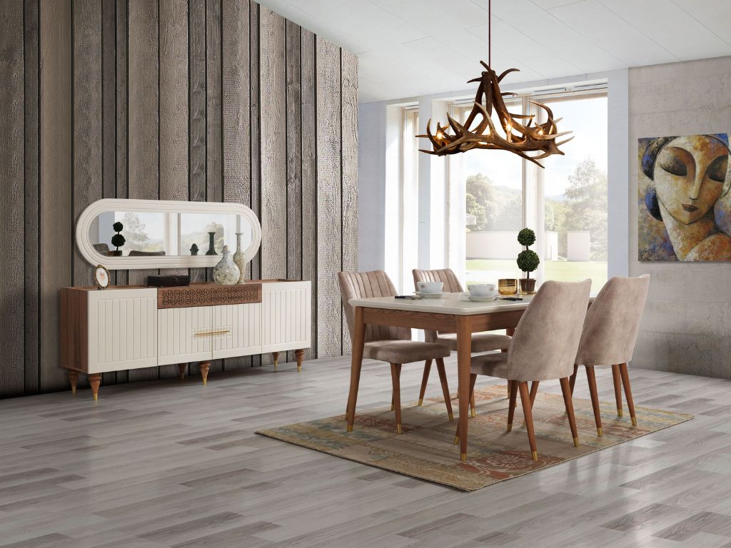 Estetik ve dayanıklılığı bir araya getiren Bodrum Yemek Odası, 1. kalite yeni trend UD, aytaşı renk suntalam ve ön yüzlerde MDF üzeri krem boya uygulanarak üretilmiştir. CNC freze ve laezer CNC çalışması, gold kulplar ile zarif bir tasarım sunar. Özel yavaşlatıcılı çekmeceler sessiz ve kolay kullanım sunar. Açılır masa sayesinde ihtiyaç halinde ekstra alan oluşturulabilir. Üstün kalite ve dayanıklılık standartlarına uygun olarak üretilmiştir.