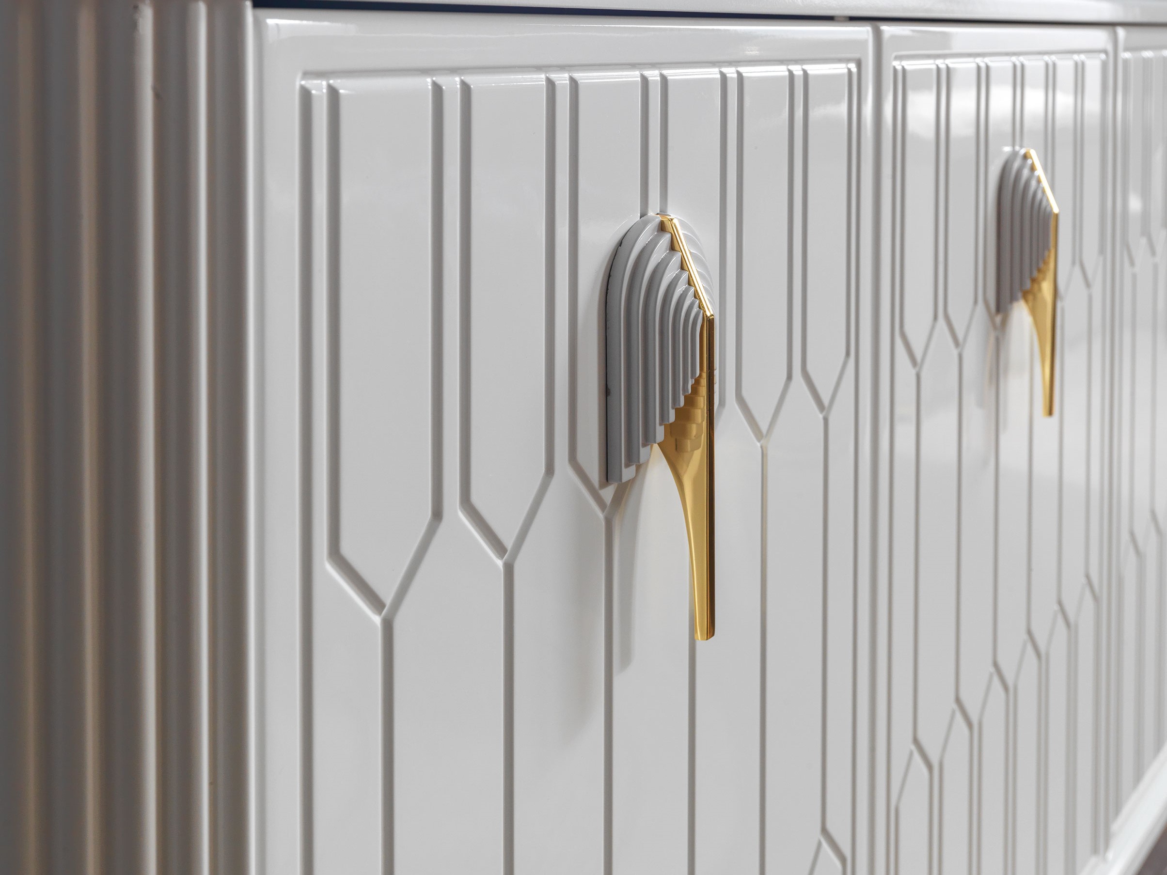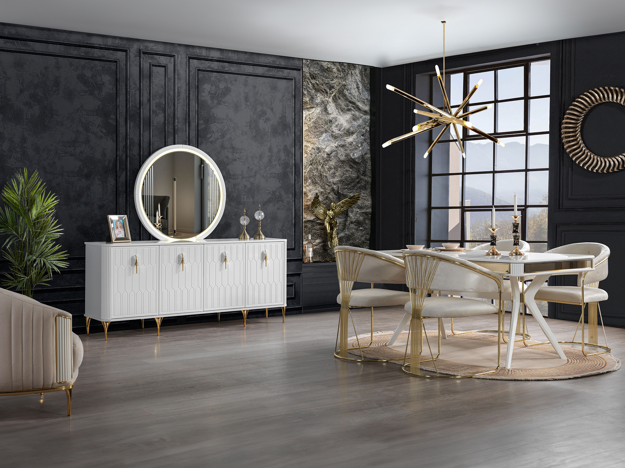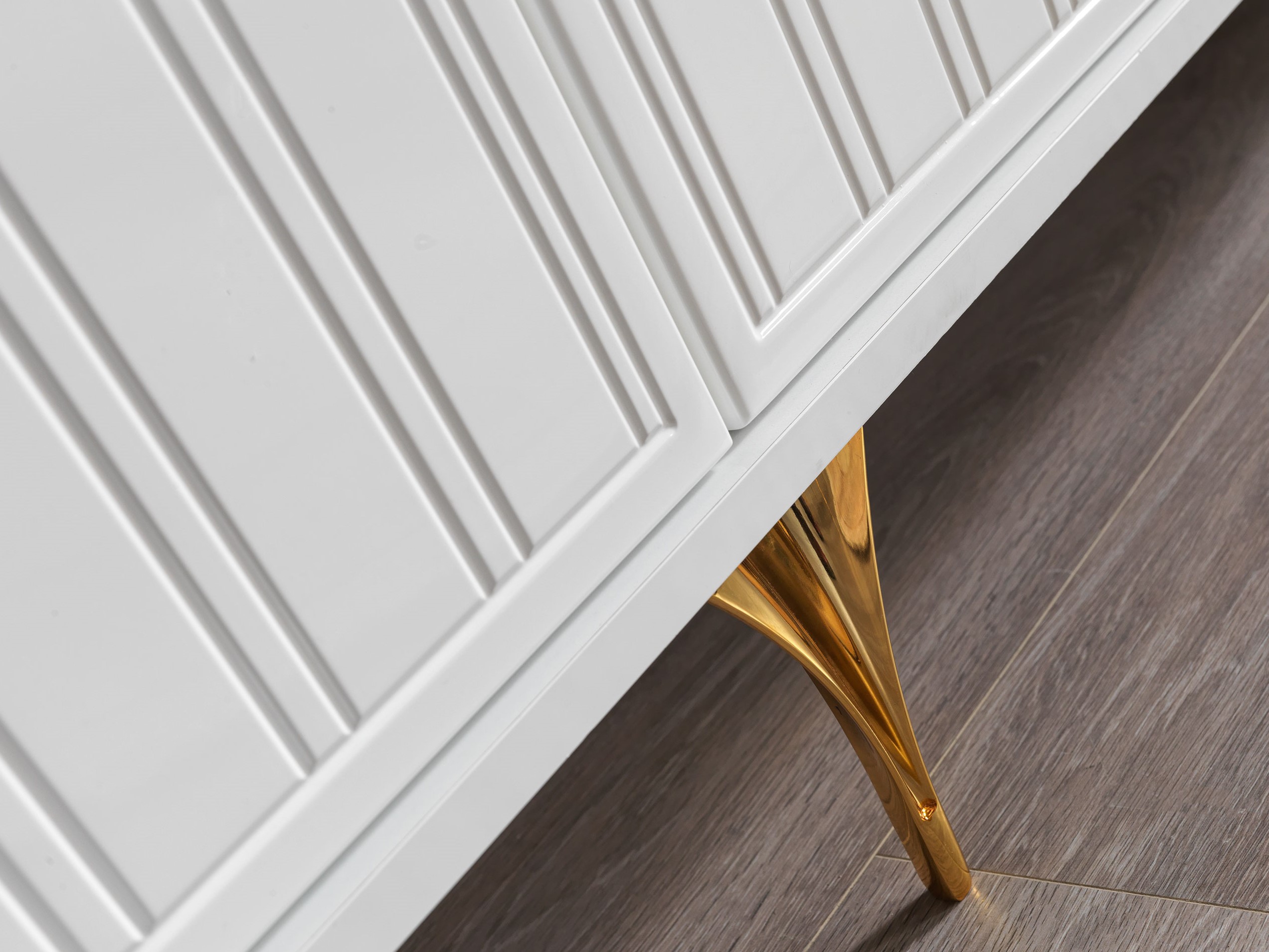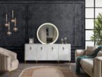 İstanbul Konsol, parlak beyaz renk suntalam malzeme ve MDF üzerine CNC freze ve lake boya çalışması, takıma benzersiz bir görsel zenginlik kazandırır. Konsolda kullanılan metal gold kulplar ve metal gold ayaklar takıma tam bir uyum sağlar ve mükemmel bir denge yaratır. Üstün kalite ve dayanıklılık standartlarına uygun olarak üretilmiştir.