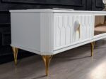 İstanbul TV Ünitesi, 1. kalite pürüzsüz beyaz renkteki suntalamdan oluşur ve ön yüzeyler ile üst kısımları MDF üzeri parlak boya ile kaplanmıştır. CNC freze ve lake boya teknikleri kullanılarak ön yüzeylere estetik bir dokunuş sağlanırken, metal gold ayaklar üniteye zarif bir duruş kazandırır. Özel yavaşlatıcılı teleskopik raylar ile donatılmış çekmeceler, sessiz ve kolay kullanım sunar.
