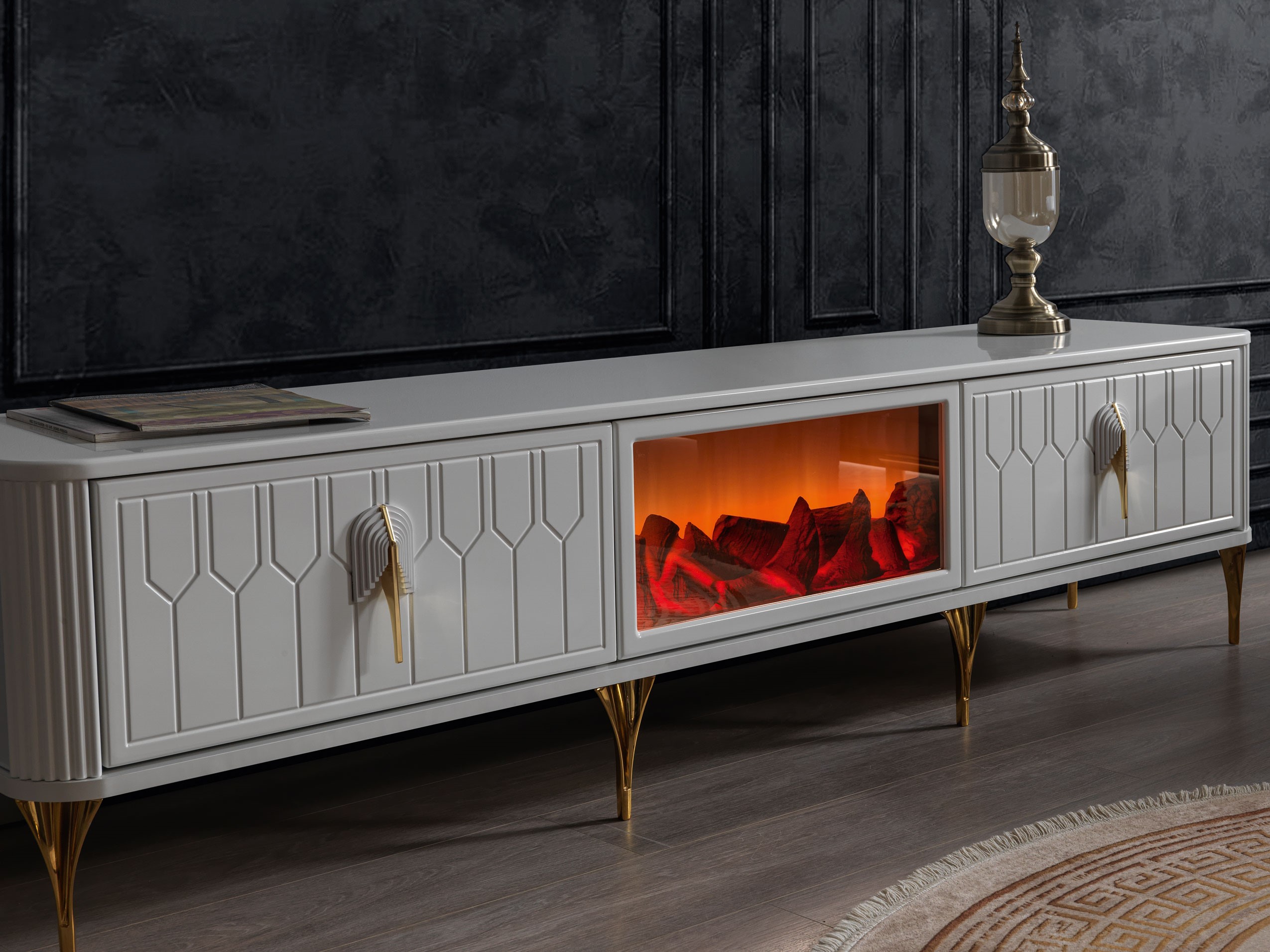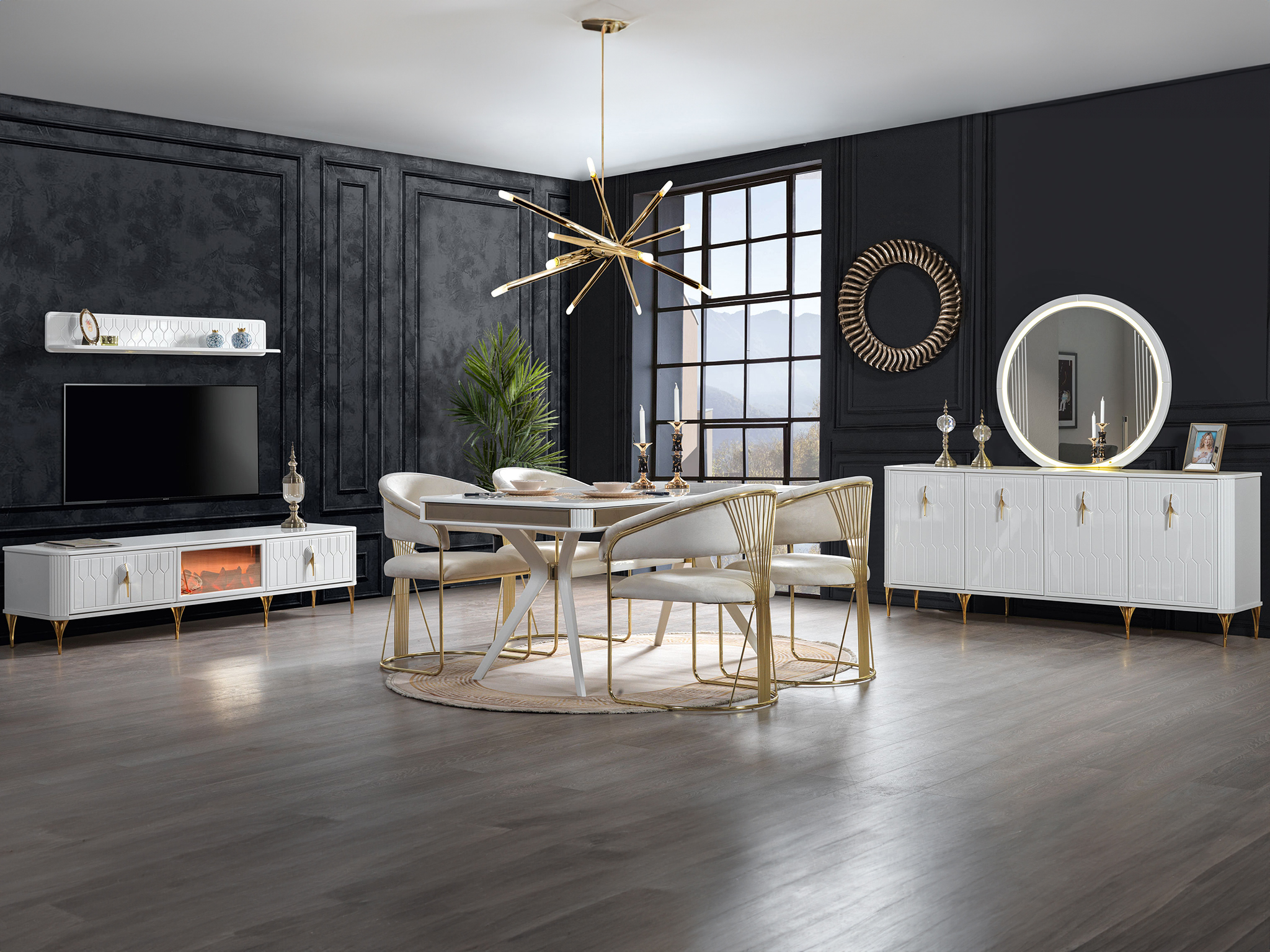 İstanbul TV Ünitesi, 1. kalite pürüzsüz beyaz renkteki suntalamdan oluşur ve ön yüzeyler ile üst kısımları MDF üzeri parlak boya ile kaplanmıştır. CNC freze ve lake boya teknikleri kullanılarak ön yüzeylere estetik bir dokunuş sağlanırken, metal gold ayaklar üniteye zarif bir duruş kazandırır. Özel yavaşlatıcılı teleskopik raylar ile donatılmış çekmeceler, sessiz ve kolay kullanım sunar.