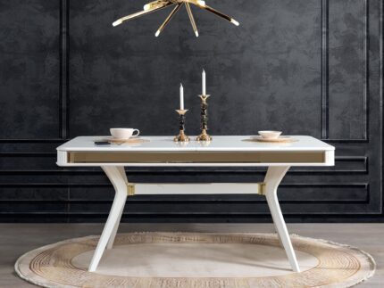 Melis Yemek Masası, 1. kalite parlak beyaz renk suntalam, MDF üzerine lake boya çalışması ve pasta cila uygulaması takıma benzersiz bir görsel zenginlik kazandırır. Açılır masa sayesinde ihtiyaç halinde ekstra alan oluşturabilirsiniz. Üstün kalite ve dayanıklılık standartlarına uygun olarak üretilmiştir.