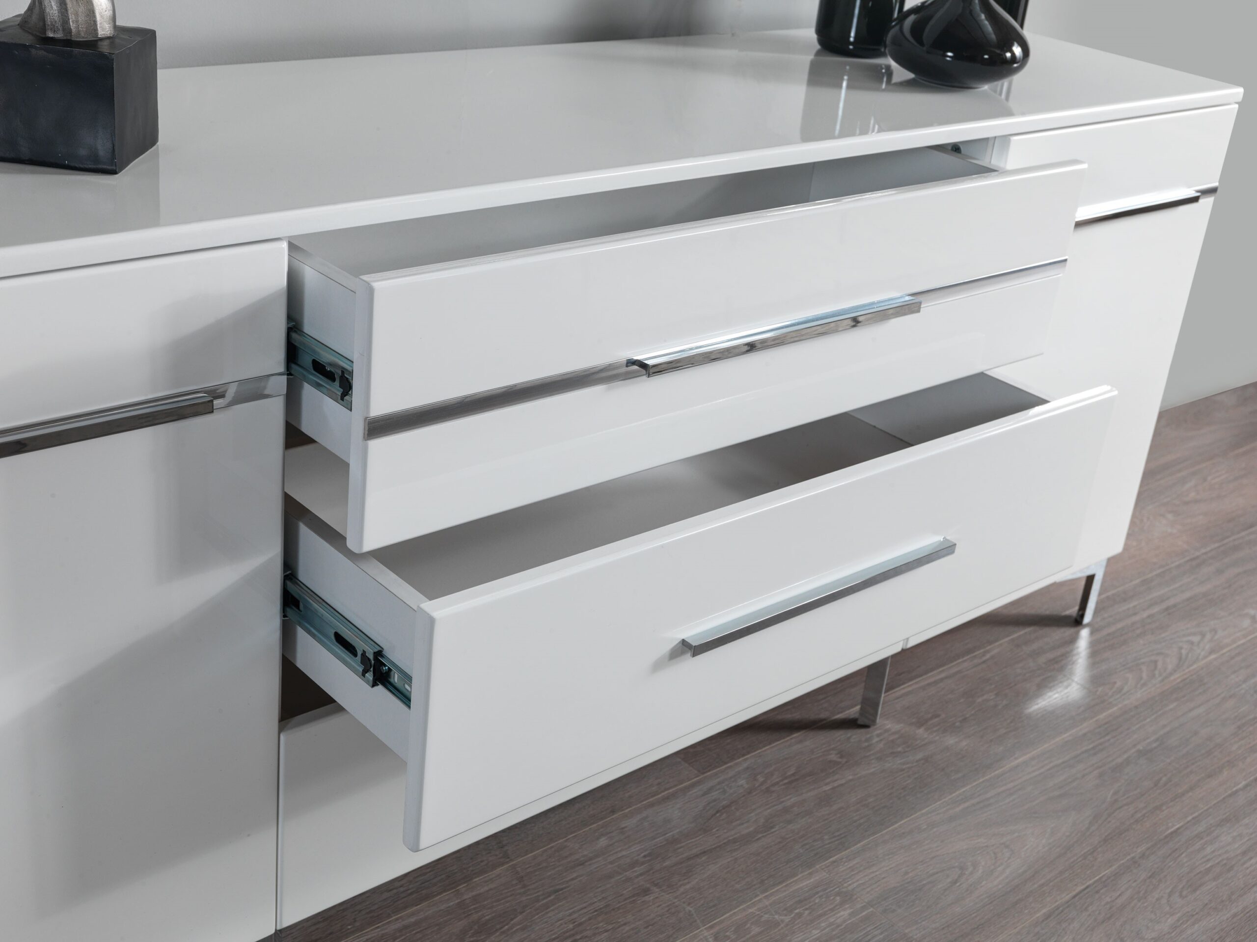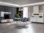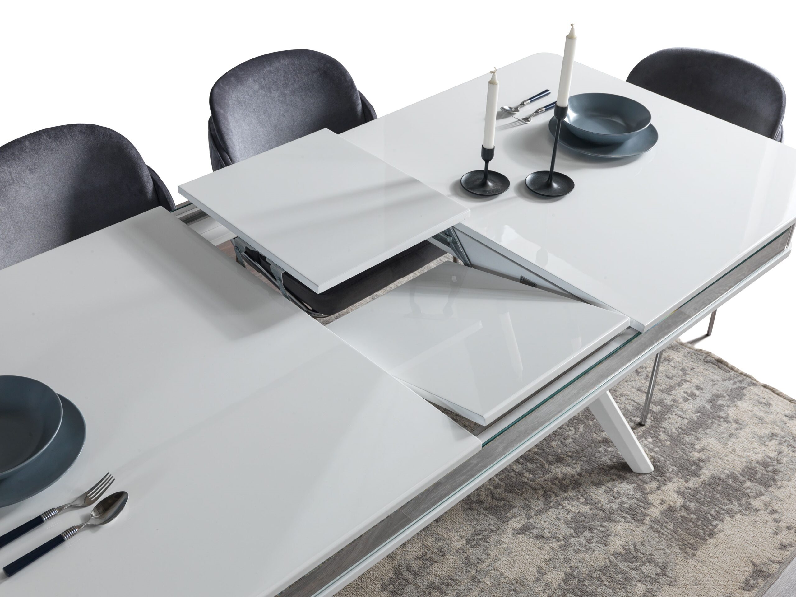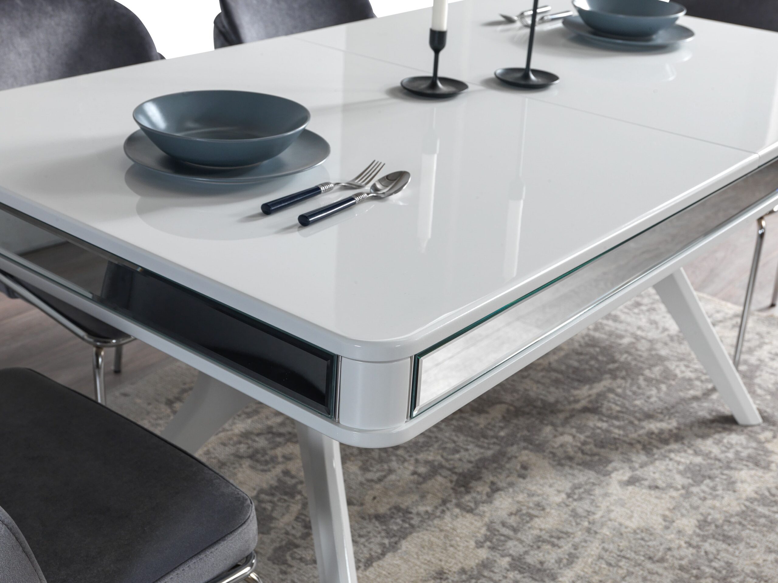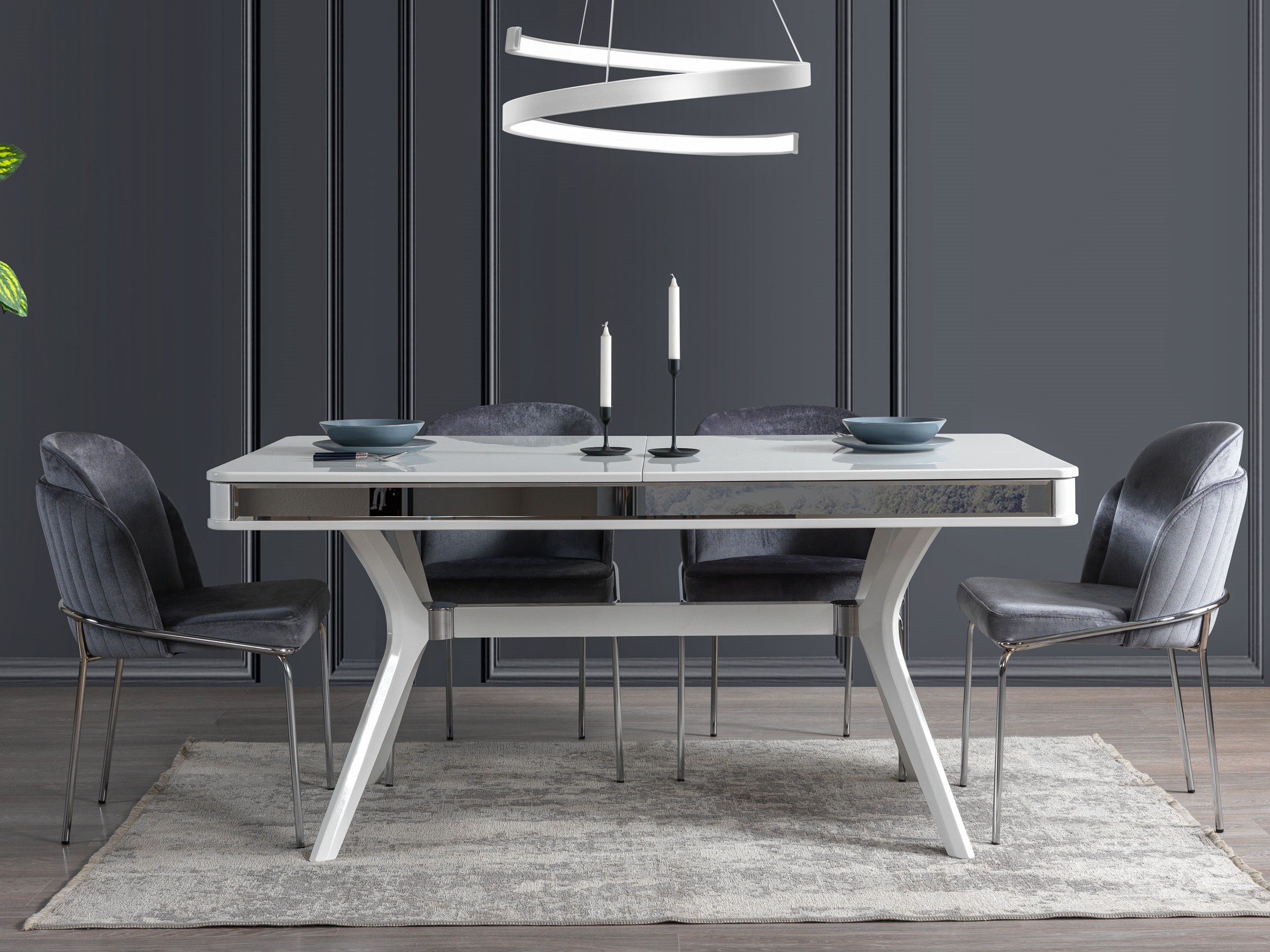 Melis Yemek Odası, 1. kalite parlak beyaz renk suntalam, MDF üzerine lake boya çalışması ve pasta cila uygulaması takıma benzersiz bir görsel zenginlik kazandırır. Sandalyelerde kullanılan metal krom ayaklar, takıma tam bir uyum sağlar ve mükemmel bir denge yaratır. Üstün kalite ve dayanıklılık standartlarına uygun olarak üretilmiştir. Açılır masa sayesinde ihtiyaç halinde ekstra alan oluşturabilirsiniz.